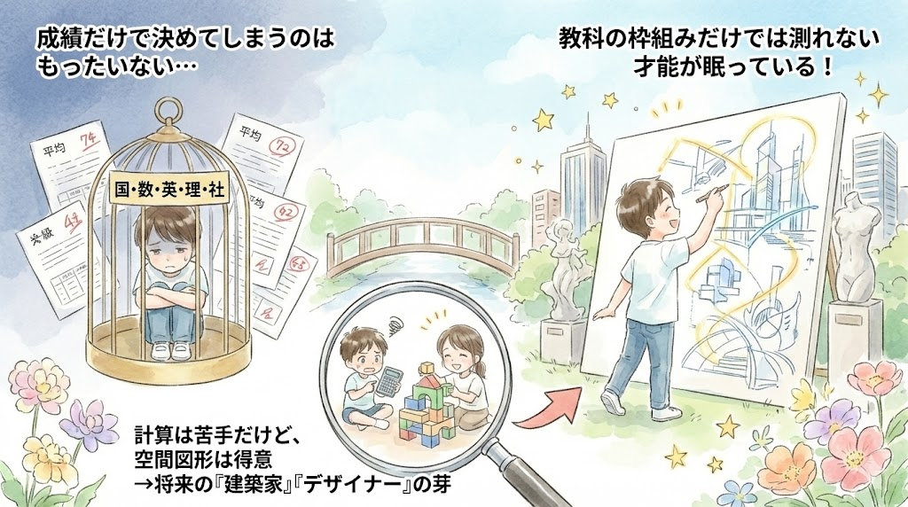 この子を単に「数学が苦手=文系」と決めつけてしまうと、将来の「建築家」や「デザイナー」としての才能の芽を摘んでしまうことになりかねません。
