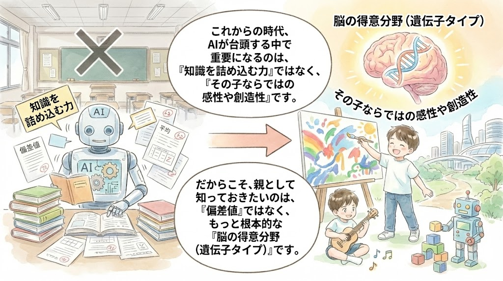 だからこそ、親として知っておきたいのは、「偏差値」ではなく、もっと根本的な「脳の得意分野(遺伝子タイプ)」です。