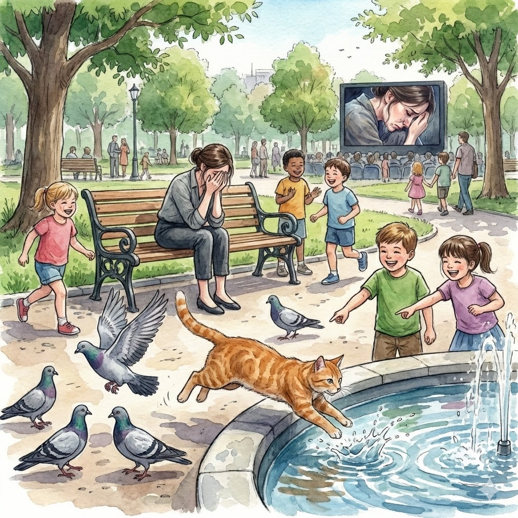 先ほど泣いていた主人公からカメラが引いていくと、実は彼女がのどかな公園のベンチに座っていたことがわかります。