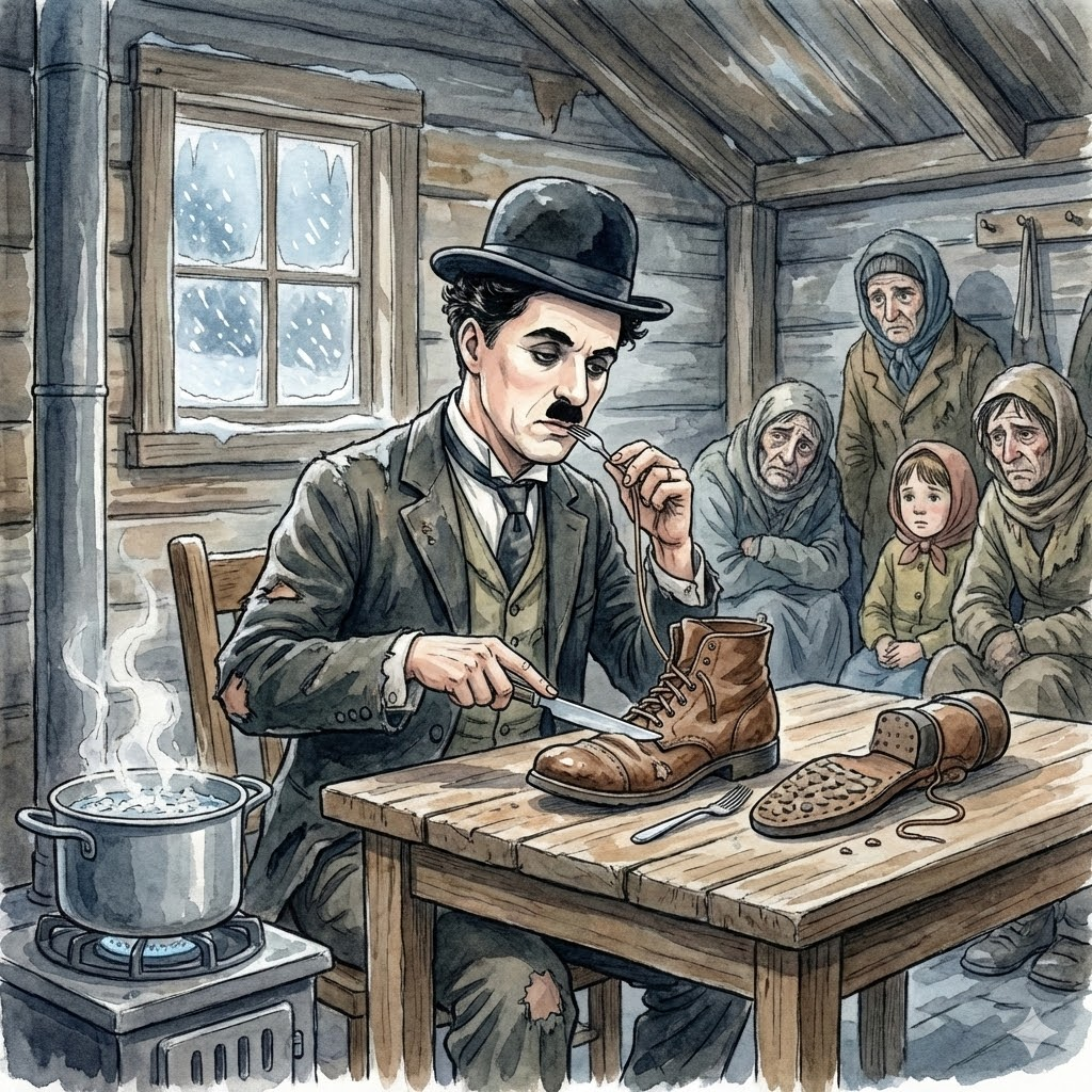 そこでチャップリンは、自分の履いている革靴を茹でて、ナイフとフォークで上品に食べ始めるのです。靴紐をパスタのように巻き取り、靴底をステーキのように切り分け、釘を小骨のようにしゃぶる。